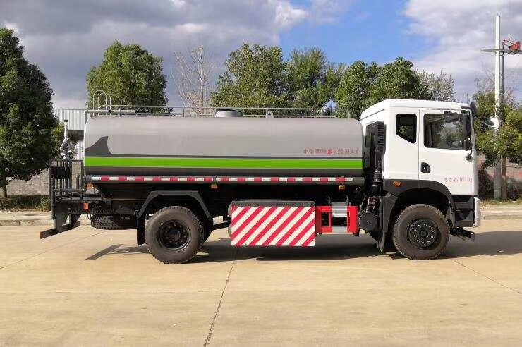 灑水車前裝有鴨形噴嘴或圓頭沖嘴,后面裝有圓柱開灑水噴嘴或蓮蓬頭噴嘴,后部有一工作平臺,裝配有水炮。后部還可裝8個噴嘴(選裝)。
