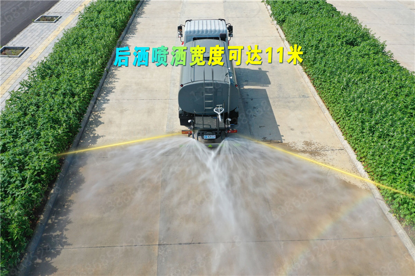 東風多利卡14方抑塵車專用功能配置:罐體有效容積9噸,采用武鋼4mm 優質碳鋼一次卷壓無縫成型,專用部分配專用灑水泵,帶前沖、后灑、側噴、后工作平臺及灑水高壓炮。配消防接口、自流閥,2根與罐體等長輸水管,水位計,1個爬梯,兩側及后杠。灑水泵自吸高度為7米,出水量為60立方米每小時,灑水寬度大于14米,后工作平臺水炮可調成直沖狀、大雨、中雨、小雨、毛毛雨,直沖射程25米左右,霧狀射程15米左右。(可選配:錳鋼罐體、加粗管道、駕駛室一鍵操作、氣動控制、罐體防腐、高端灑水泵)