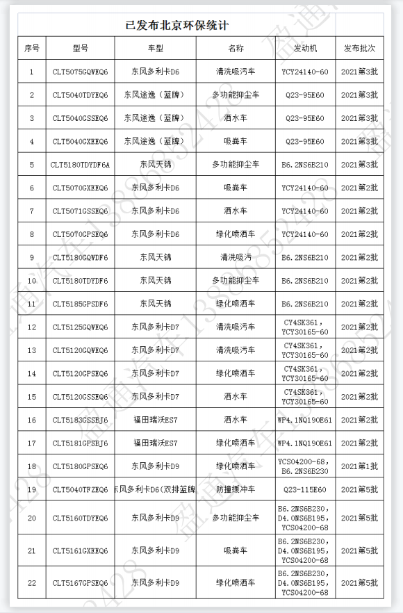 | 18 | CLT5180GPSEQ6 | 東風(fēng)多利卡D9 | 綠化噴灑車(chē) | YCS04200-68,B6.2NS6B230 | 2021第1批 |