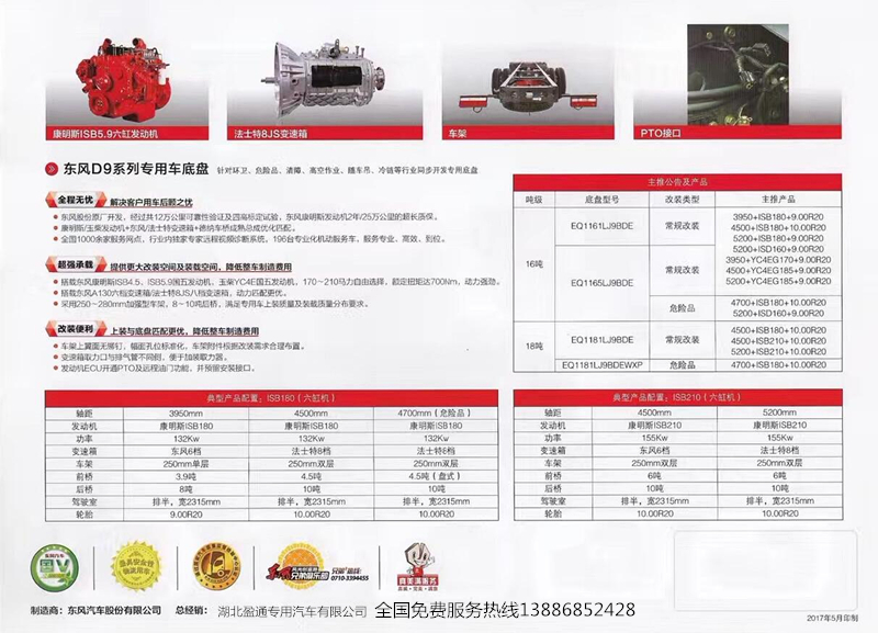發動機為東風康明斯180馬力(國五)或康明斯210馬力(國六) 變速箱為東風商用六檔變速箱