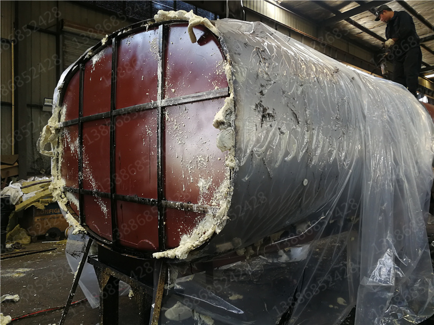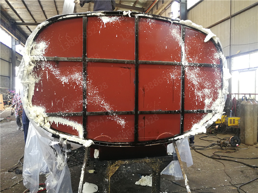 3. 保層溫的制作是在水罐外部另外焊接10mm厚的支撐骨架,然后用保溫材料將骨架內(nèi)部填充滿,**在骨架外蒙上一層外皮。 保溫層外表鐵皮采用8mm厚高強度耐磨板,可選擇使用不銹鋼分鏡面8K或磨砂板