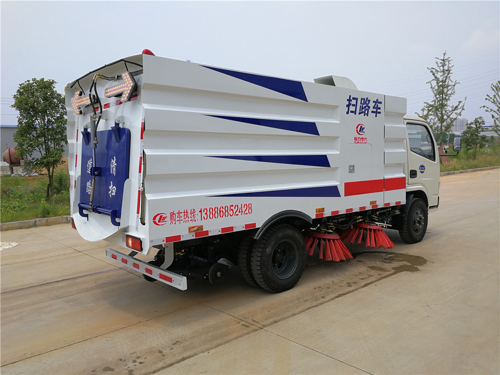 該掃路車采用東風多利卡二類底盤改裝,加裝副發動機、風機、清水箱、垃圾箱、左右立掃、掃盤降塵系統,液壓系統、專用裝置電控系統和副車架等改裝而成。