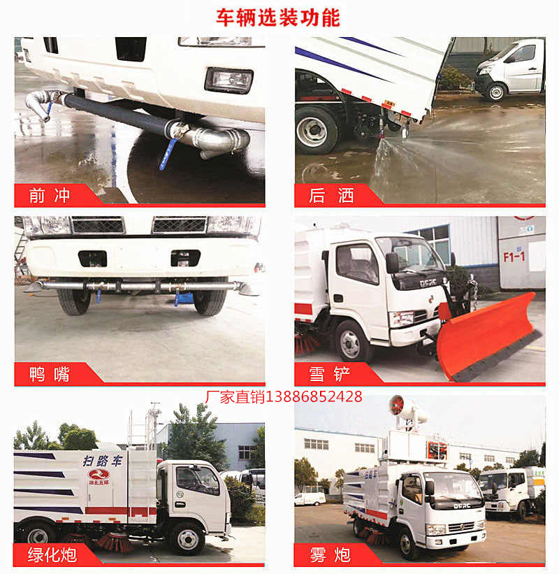 車輛可加裝前、后噴霧,在節(jié)約水的 同時消除二次污染及美化路面的效果。