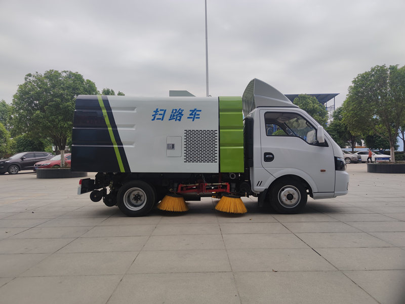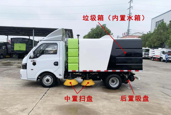 掃路車采用“中置四立掃+后置吸盤” 的布置結(jié)構(gòu),掃刷是用來清掃地面的垃圾 及污垢,作業(yè)時掃刷由外向內(nèi)把垃圾集中 掃到車輛底部,再通過吸嘴把垃圾吸入到 垃圾箱內(nèi)